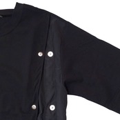 前面のドット釦付きタックがシルエットの変化をもたらす。