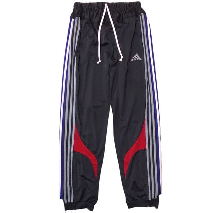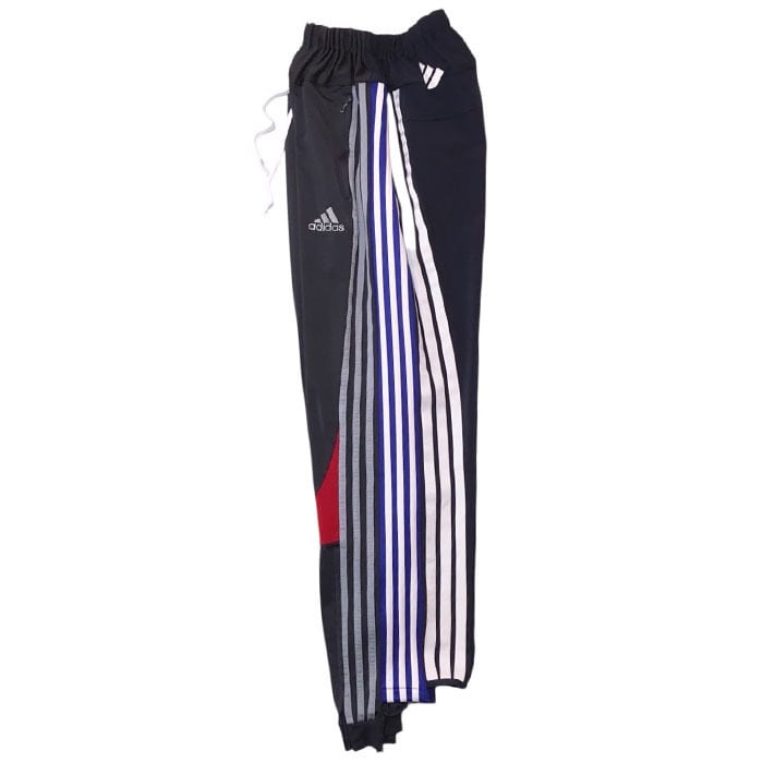 These docking pants are created by deconstructing and reconstructing two different pairs of used track pants.