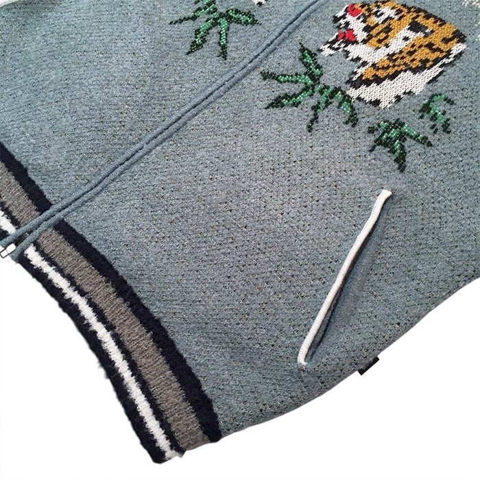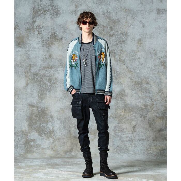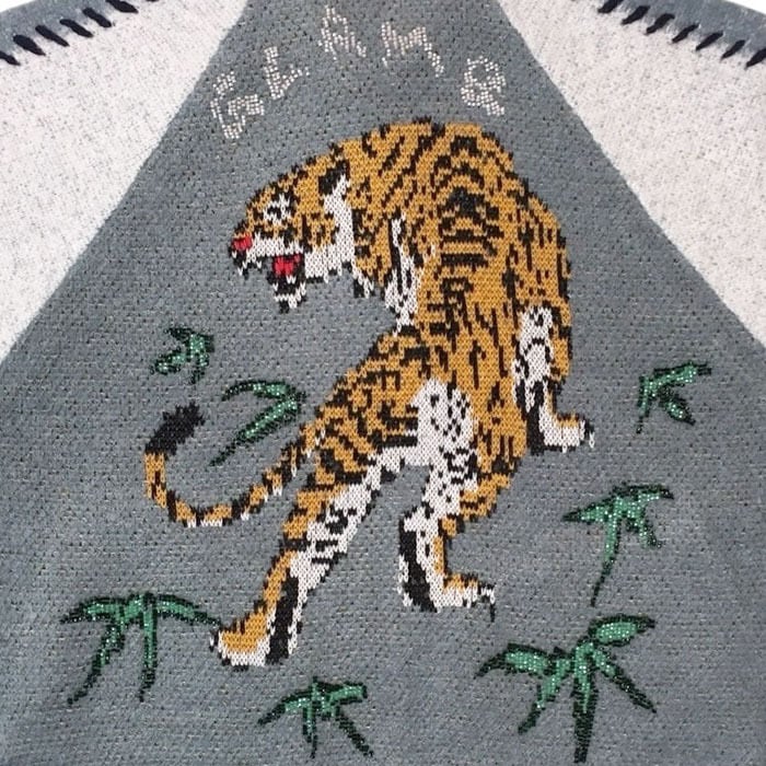 This season's glamb collection, themed “Dance in Hidden Valley,” proposes a world where everyday life and fantasy blur. The Knit Ska Jumper reimagines the brand's iconic souvenir jacket using different materials. The raglan-sleeved body features an oriental pattern—a classic ska jumper design—but swaps the satin fabric for knit. The tiger pattern is jacquard, while the brand logo and bamboo leaf motif are adorned with beads meticulously hand-applied by the brand's trusted factory. The arms feature thick thread stitching mimicking piping, among other thoughtful details. The silhouette offers a just-right fit, with both the body width and length kept compact. Enjoy it as outerwear on its own, or layer it under a coat or blouson for a double-layer look.
