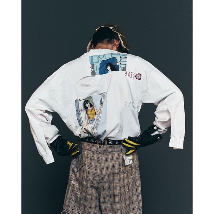 This long-sleeve T-shirt is deconstructed and reconstructed using patchwork, featuring bold prints of several luxurious graphics by Hisashi Eguchi, known for his representative works like Stop!! Hibari-kun! and Old Man Z.