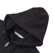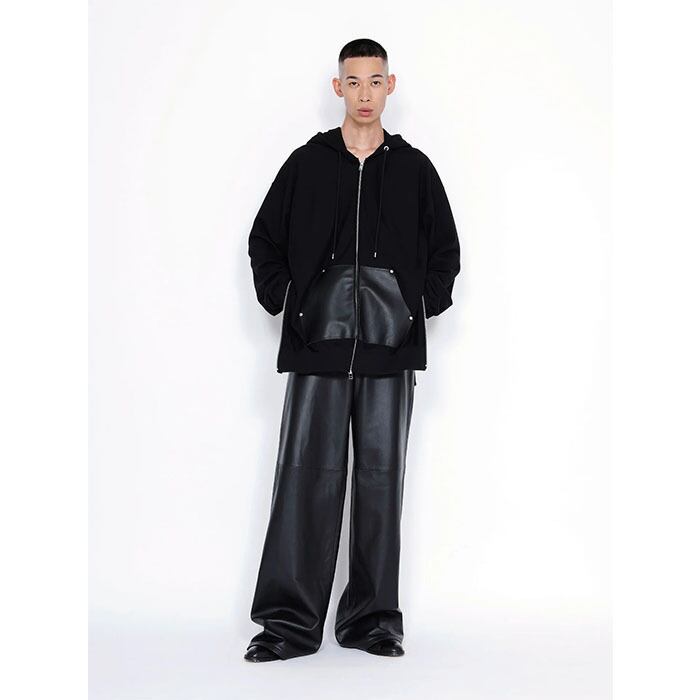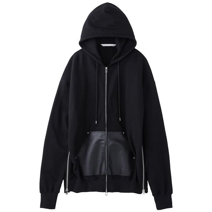 フロントに身頃と同色のレザーポケットを配したジップアップフーディー。