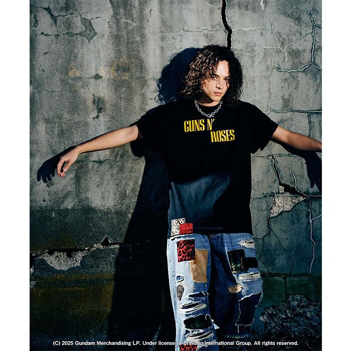 The GUNS N’ ROSES Cross T-Shirt reinterprets the iconic artwork from Guns N' Roses' 1987 album, incorporating glamb's unique take on the design into clothing. The standout feature is the back print, which reimagines the cross motif seen on the album ‘Appetite for Destruction’ using a rose pattern. Additionally, band motifs are randomly applied to the body using slub and velvet fabrics, blending rock aesthetics with craftsmanship for a signature glamb aesthetic. The body is made from 100% cotton, 5.6-ounce medium-weight jersey, offering a regular fit. The comfortable construction makes it a reliable companion for everything from streetwear to festivals.