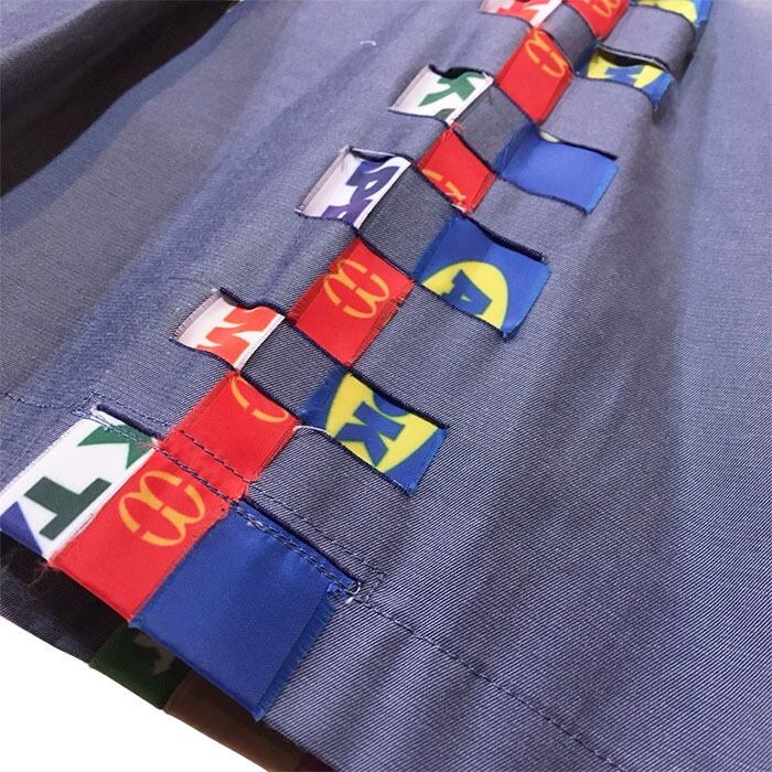 6種類のオリジナルロゴテープを1点ずつ手作業で織り込む裂き織りで脇にデザインを施しました。
