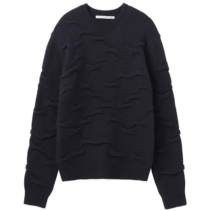 戦後ドイツを代表する芸術家アンゼルム・キーファーの作品に多く登場する砂、草、藁、鉛の織りなす表情を、3ゲージのタック編みで表現したデザインのニットセーター。