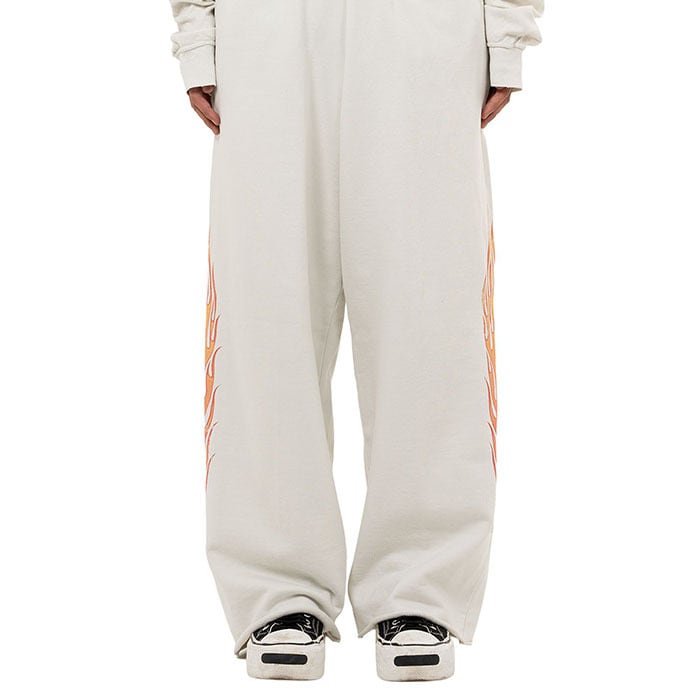 These sweatpants feature a wide silhouette and an impressive fire frame design on the side.