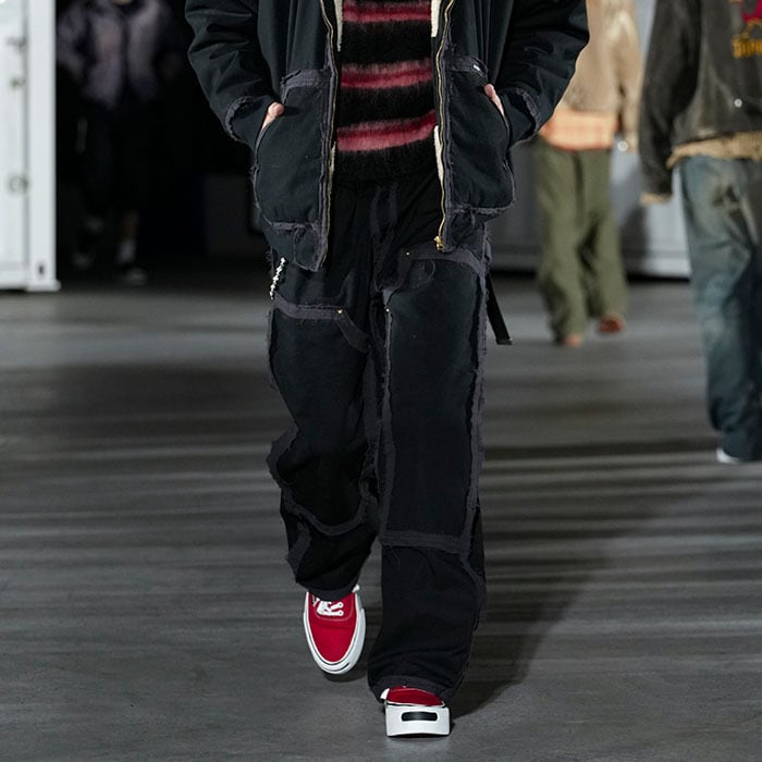 This is a collaborative deconstructed painter pants design between KAMIYA and blackmeans.