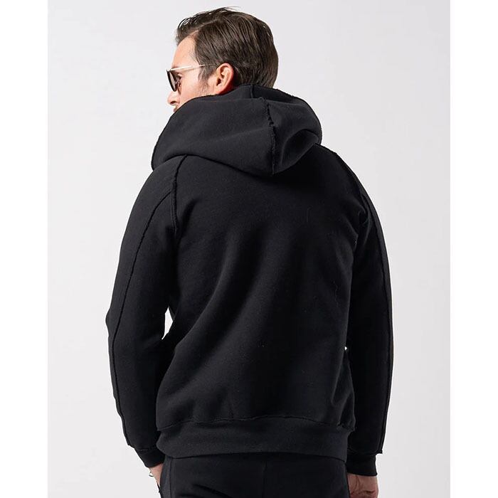 素材を考慮した独自のカッティングや附属使いにより、ミニマルな外観を維持しつつもやり過ぎないデザインアクセントを生みだしているラグランスリーブパーカー。
