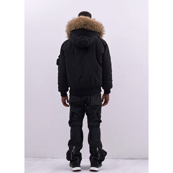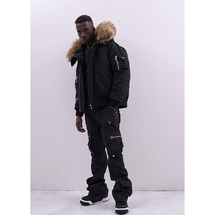 The trendy volume fur is detachable. The hood's fold-over can be secured with uniquely designed buttons, allowing it to be worn as a hooded jacket.
