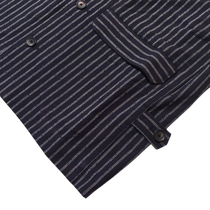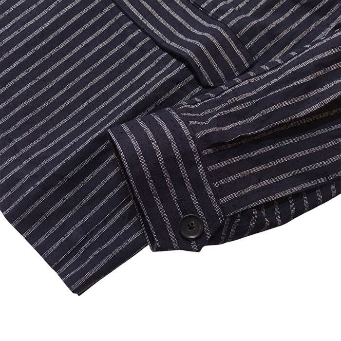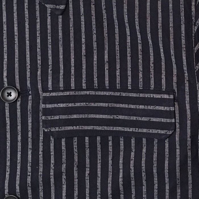 Coveralls made from striped fabric using curled yarn, washed to give the surface a fuzzy texture.