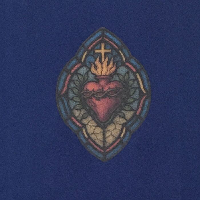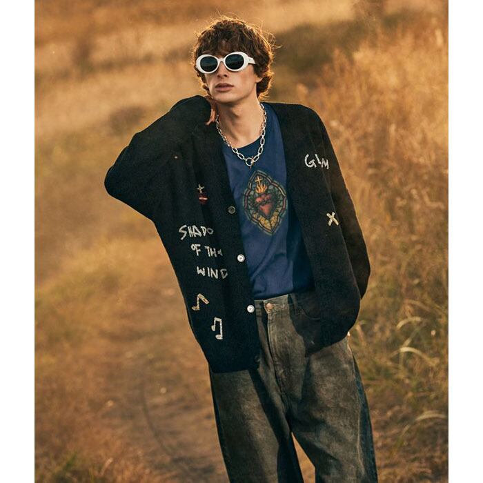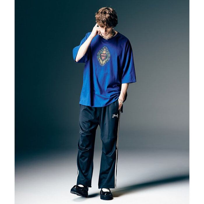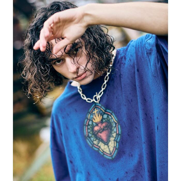 This piece updates last spring's popular Stained Glass T-Shirt with a witty twist. While using classic stained glass as the design base, the figure on the right side of the back plays a modern guitar instead of a historical lute. The front features a cross & heart motif seen in Latin American culture, resulting in a quintessential glamb design that blends past and present, East and West. The body uses a 100% cotton jersey knit, woven from US-style open-end yarn into a 6.2 oz medium weight. Its charm lies in the texture that softens and conforms to the body with wear. The silhouette is a big fit, featuring a longer length and wider body width. Slits on the sides enhance ease of movement and styling versatility.