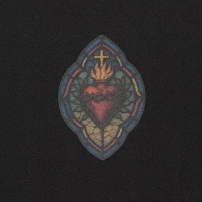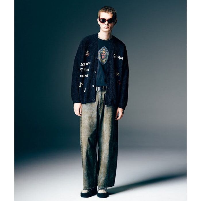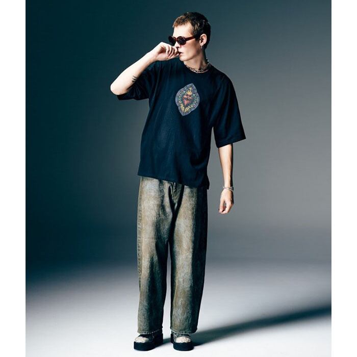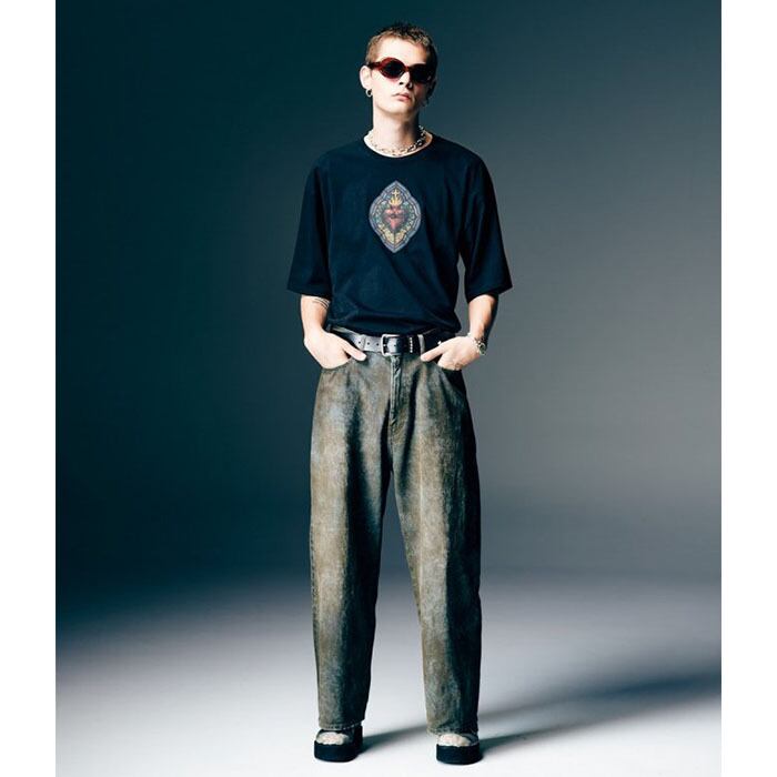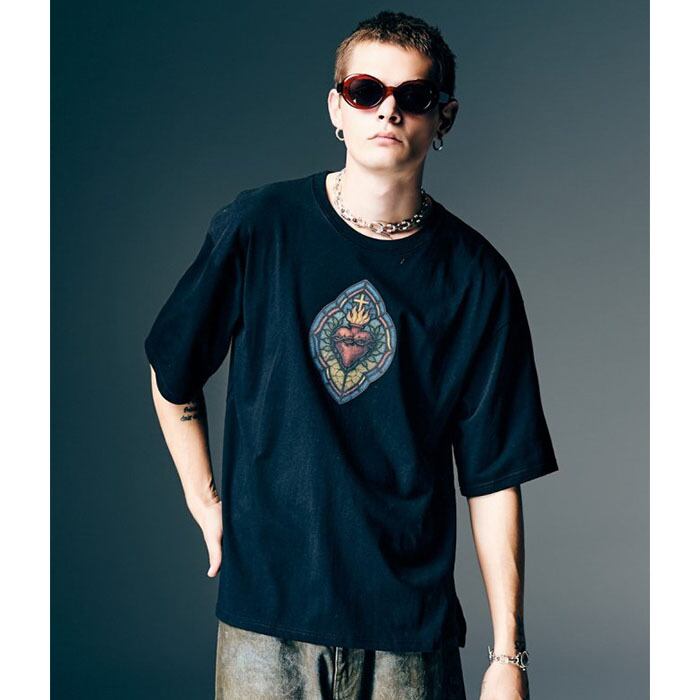 This piece updates last spring's popular Stained Glass T-Shirt with a witty twist. While using classic stained glass as the design base, the figure on the right side of the back plays a modern guitar instead of a historical lute. The front features a cross & heart motif seen in Latin American culture, resulting in a quintessential glamb design that blends past and present, East and West. The body uses a 100% cotton jersey knit, woven from US-style open-end yarn into a 6.2 oz medium weight. Its charm lies in the texture that softens and conforms to the body with wear. The silhouette is a big fit, featuring a longer length and wider body width. Slits on the sides enhance ease of movement and styling versatility.