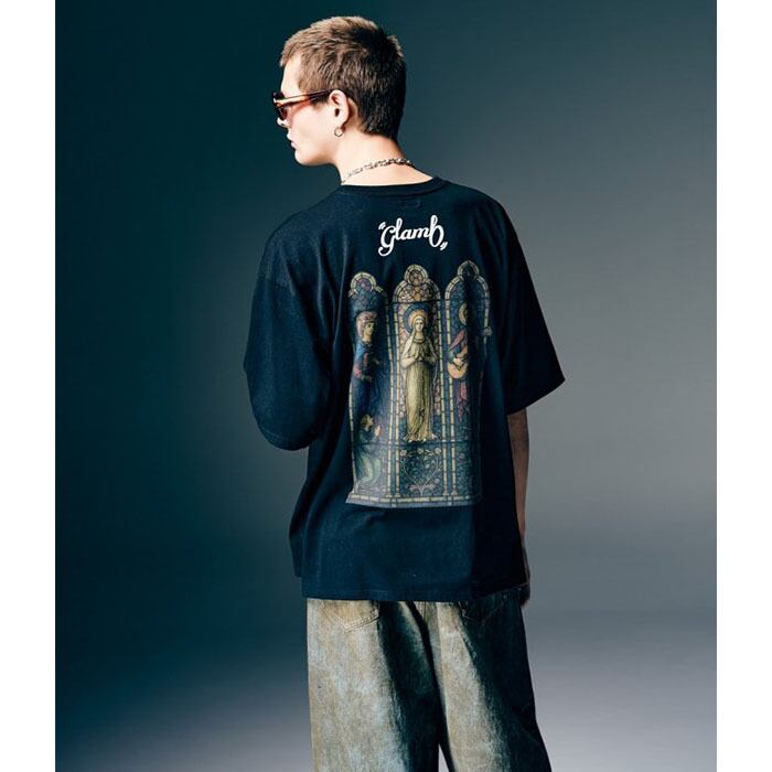 昨春に好評を博したStained Glass T-Shirtをウィットあるアイデアを掛け合わせてアップデートした1枚が登場。クラシカルなステンドグラスをデザインのベースとしながら、バックスタイル右列の人物は古楽器リュートではなく現代的なギターを演奏。フロントでは中南米カルチャーに見られるクロス&ハートモチーフをあしらい、古今東西のデザインミックスをコレクションに展開するglambらしい仕上がりとなっています。ボディに用いたのはUSライクなオープンエンド糸を6.2オンスミディアムウェイトに編み上げたコットン100%の天竺生地。着るほどに身体になじむ風合いが魅力となっております。シルエットは着丈を長めに、身幅を広めに設けたビッグシルエット。サイドにはスリットを設けており、動きやすさとスタイリング性をもたらします。