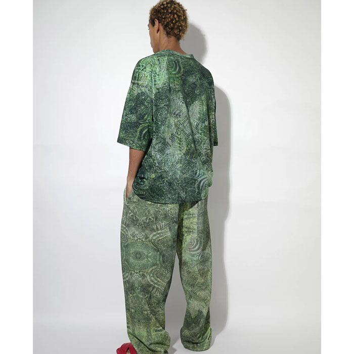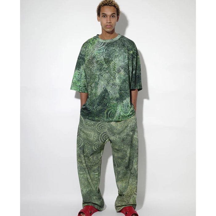 ワイドシルエットの総柄Tシャツ。