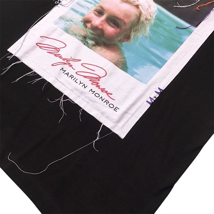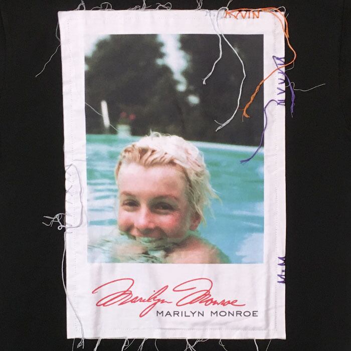 The Marilyn Monroe photo is printed on a separate fabric and applied using a patchwork technique, designed to show the fabric's characteristic fraying around the photo.