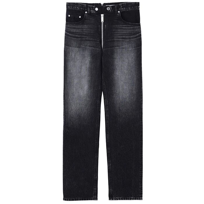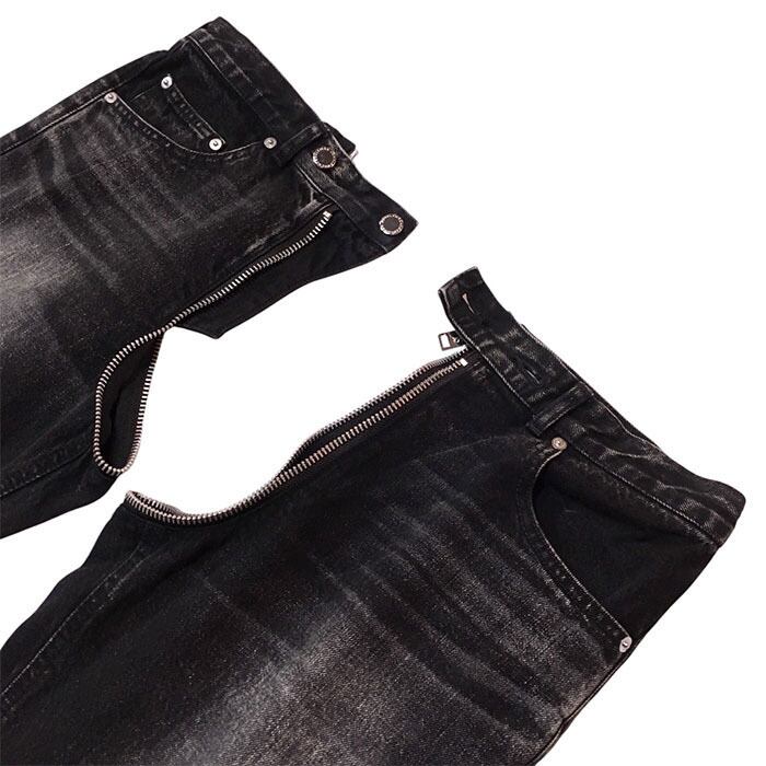 フロントからヒップまで大胆にジップを走らせたフェティッシュなデザインのデニムジップ5ポケットパンツ。