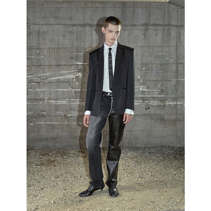 The left and right sides can be separated, allowing for custom docking with the matching leather pants sold separately, as shown in the look.
