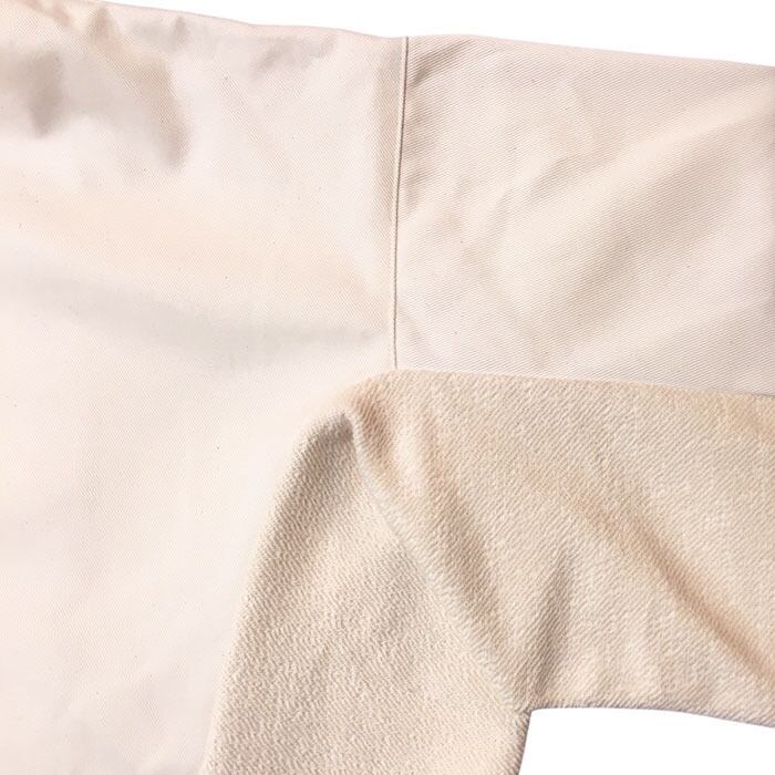 オーガニックコットンとリサイクルナイロンとの混紡糸を使用したツイル素材と、T/Cの特徴である、洗える・乾きやすいはもちろんの事、太番手の9番単糸ながらソフトな風合いで仕上がりました。