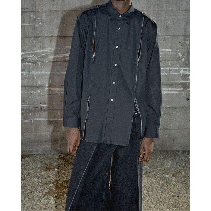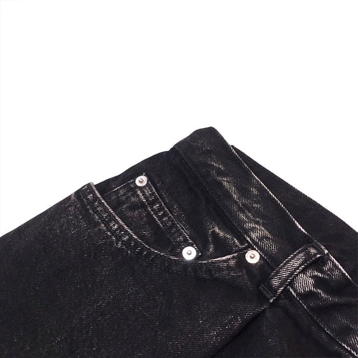 クラシックな5ポケットディテールをベースに、前身頃へ分量を集約した独特のフォルムを形成しています。