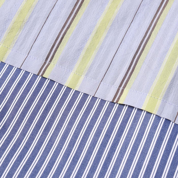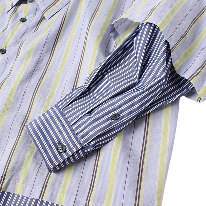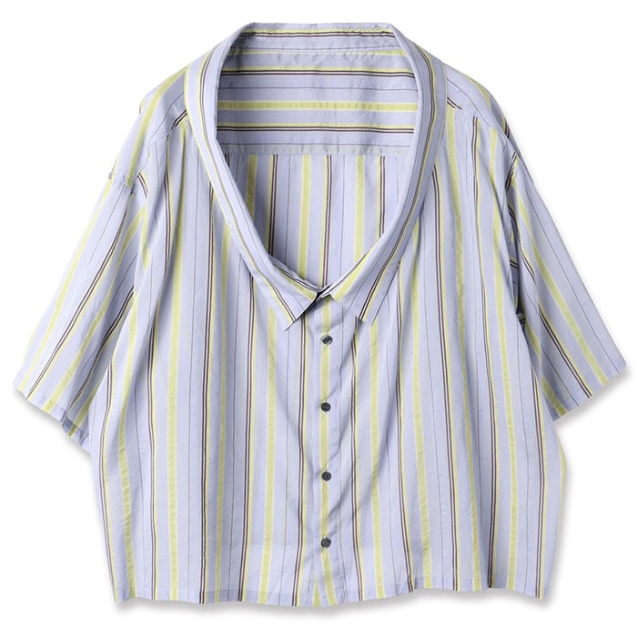 The top layer features a multi-stripe fabric made from cupro (derived from cotton linters) and high-twist yarn, offering a dry feel. Designed with a loose, open front-drop silhouette, it serves as a versatile layer that pairs well with any item.