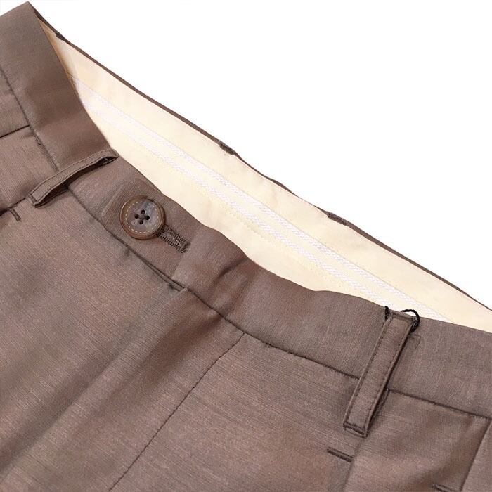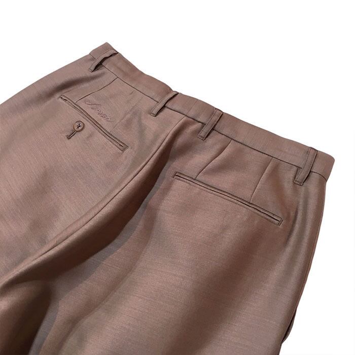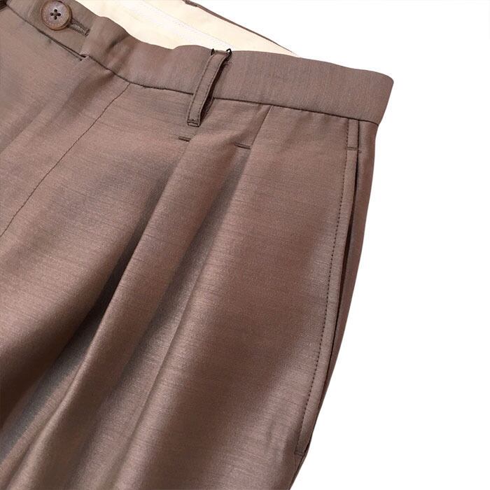 デザインはフロントに2タック入れヒップ周りにゆとりを入れバックサイドを前振りにして膝位置にタックを入れる事で立体感のあるワイドトラウザーズとなります。