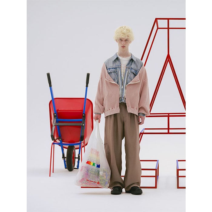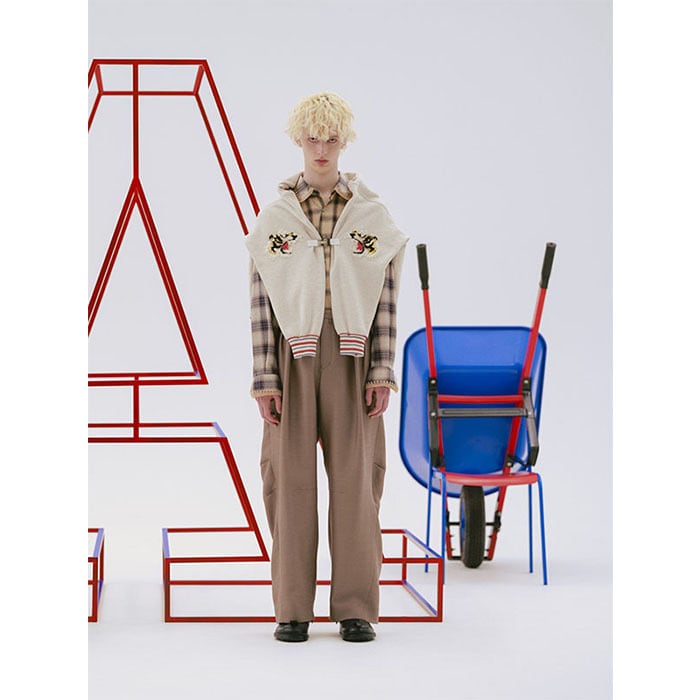 The design features two front tucks, providing room around the hips. The back is cut slightly forward, and a tuck is added at the knee, creating wide trousers with a three-dimensional silhouette.