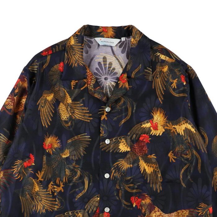 NIPOALOHA ニポアロハ / SILK LONG SLEEVE ALOHA SHIRT (COCK FIGHTING x BLACK BLUE) [NIPOALOHA-N26-SLSH02]