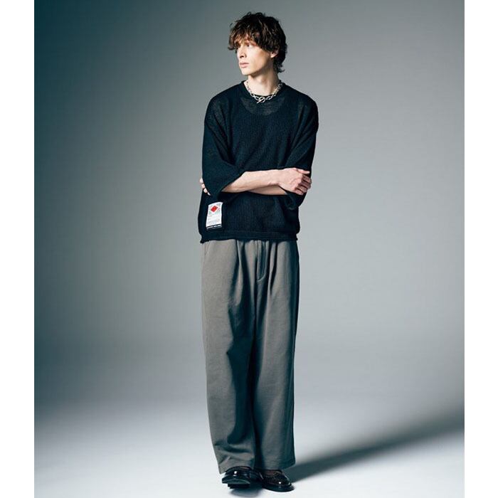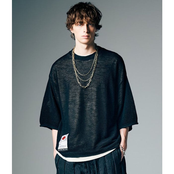 The Linen Mix Pullover Knit uses knit fabric to add rich texture to simple summer styles. The body features a wide cut combined with dropped shoulders and three-quarter sleeves, creating a relaxed, airy silhouette. By incorporating a linen-blend fabric with a crisp, cool feel, we’ve crafted a look that captures the essence of the season. The knit features a mesh base with subtle openwork, creating a textured surface. The neckline, hem, and cuffs are finished with a curled edge, giving the appearance of a raw cut. While the overall look is understated, the design is packed with the brand’s signature attention to detail.