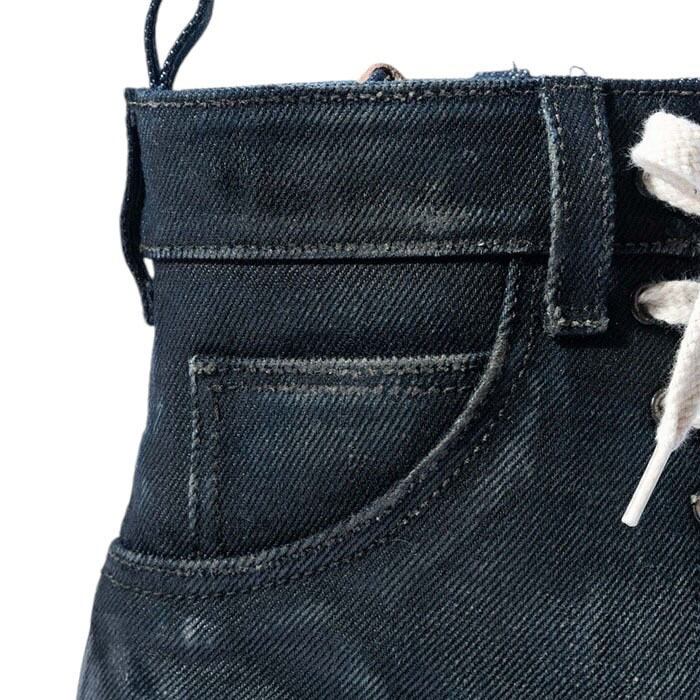 Denim boots that have become one of the representative items of glamb with the denim craft of the true spirit in the lace-up boots. The Oiled Denim Boots are now available with the essence of British work style crossed with it. They are characterized by a heavy texture formed through a series of processes including hand-bleaching, black oiled coating, and shaving. The brand's original asymmetrical paper patches, belt loops, side pockets, and lamb-stitched faux pockets are all details that replicate 5-pocket denim. The main body is carefully crafted at a Tokyo shoe factory in consideration of daily use, with a side zip on the inside of the body.