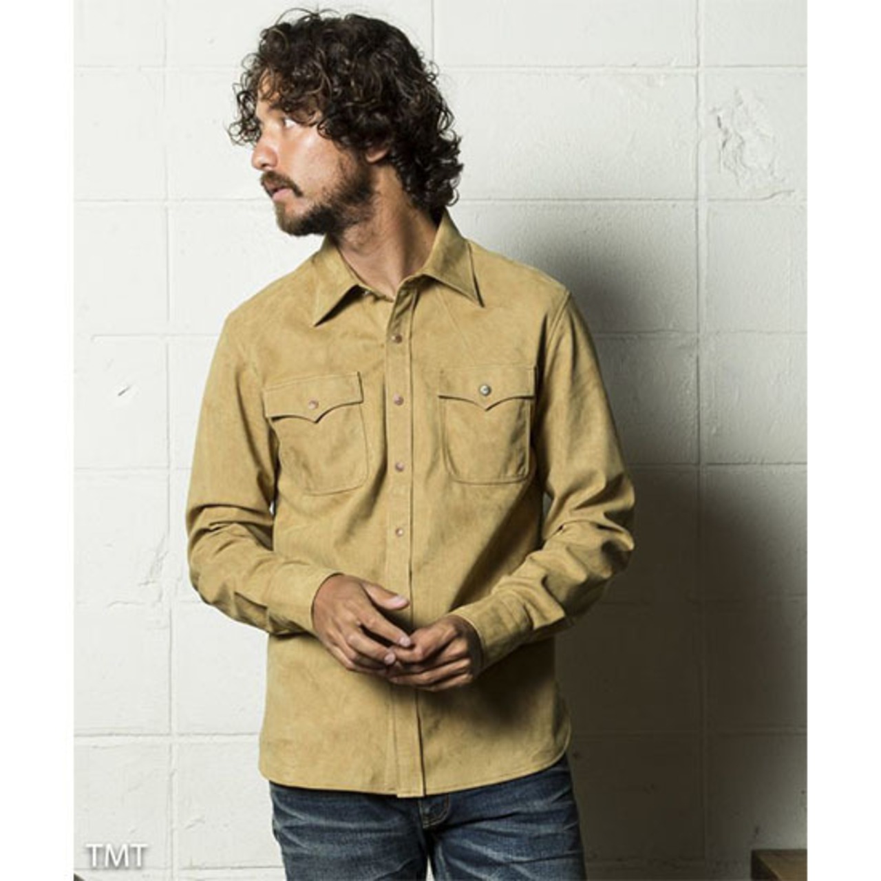 天然皮革と同じ三次元構造で、生地表面に色の陰影をつけ、天然皮革に限りなく近いナチュラルな表面感とタッチを実現したフェイクスウェードシャツ。