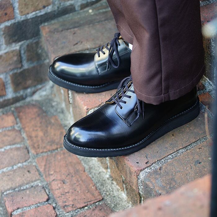 アッパーのガラスレザーは珍しい肉厚なものを使用しており、ビジネスシューズにはない重厚感を持っています。