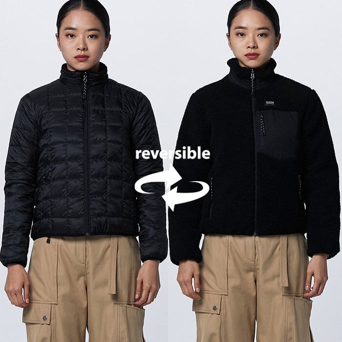 表側はダウンジャケットとして、裏側ではボアフリースジャケットとして着用可能なリバーシブルジャケットです。