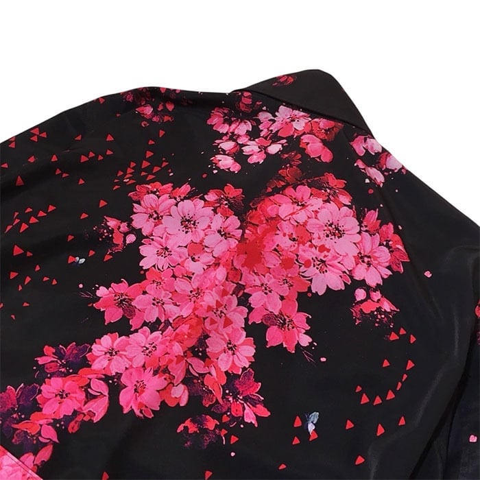 トップスだけでなくインナーにした際も舞い散る桜が目線を奪います。