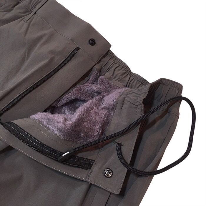 マイクロフリースの様な起毛の素材を採用しており、ウエストから裾先まで配し、保温性と通気性を両立。