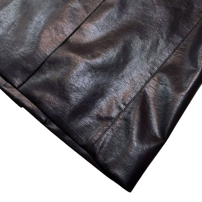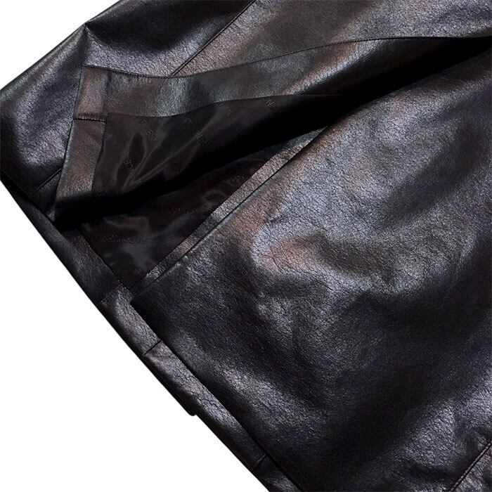 This single-breasted coat is made of vegan leather, a thin and lightweight material with excellent heat retention properties.