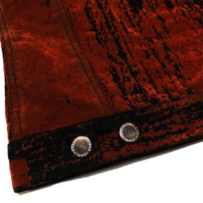 Inspired by the rust and mold symbolizing “memory” and “the passage of time” depicted in the works of Anselm Kiefer, a leading post-war German artist, the art director duo AHONEN & LAMBERG created the original graphic. The flocked black denim is further treated with a used finish. The contrast between the worn areas and the original fabric expresses a decadent beauty.
