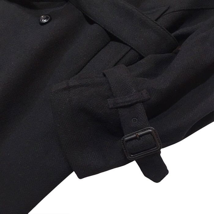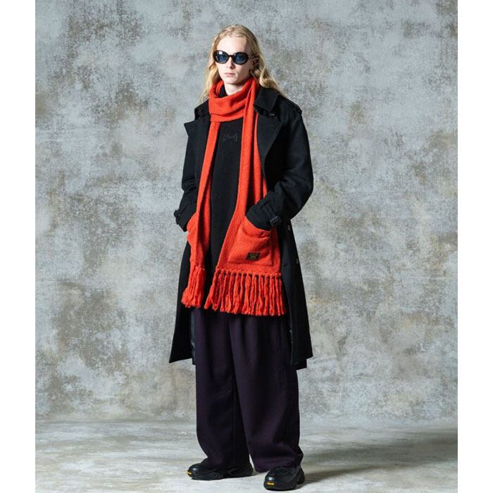 The Big Trench Coat features a long silhouette that drapes to the feet, creating a classic coat styling. It faithfully incorporates historical trench coat details like the umbrella yoke, cuff straps, and waist belt. The fabric uses a herringbone weave with a refined texture (50% wool), and the oversized fit lends an antique-like presence. The hook-and-eye closure and chin strap at the neck allow for styling adjustments, including converting it into a stand-up collar depending on the weather. This piece also evokes the image of wandering, an inspiration glamb has drawn upon since the brand's founding, alongside grunge.