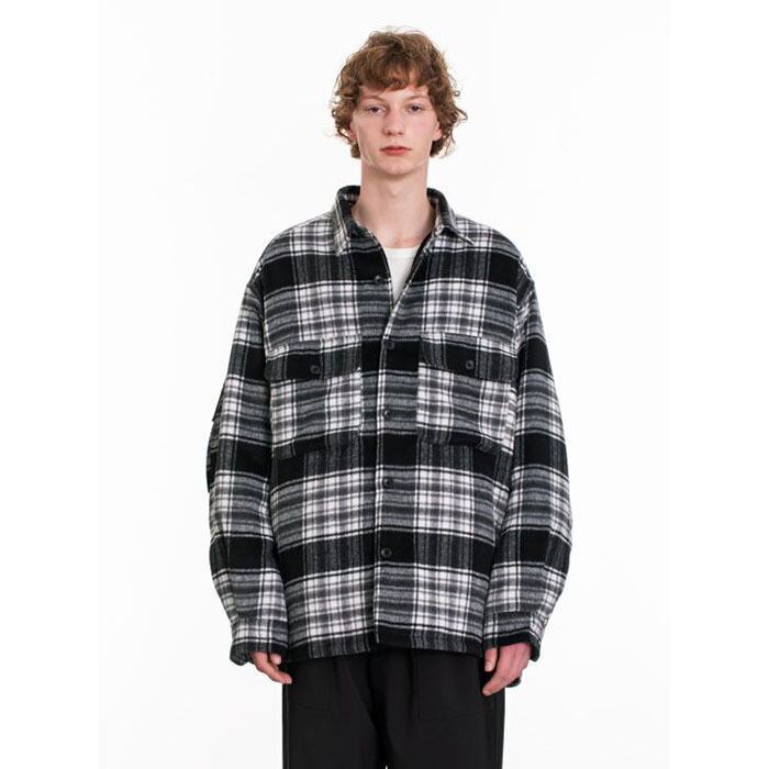 It is moderately thick and has a fluffy volume, and the raised surface gives it a warm surface feeling. The unique lightness and softness of the inside is made comfortable to wear because of the padding. It is finished in an oversized silhouette and has pockets on the side, so it can be used as a light outerwear like a shirt jacket that can be worn over knitwear or sweatshirts. It is a simple yet very useful item that can be used with a variety of coordinates.