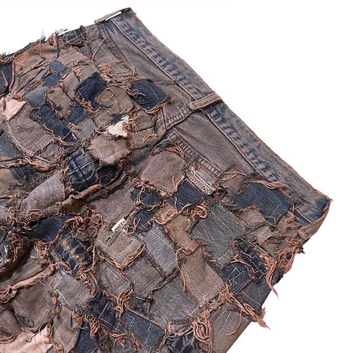 新たなリメイク技法としてスクエアにカッティングされたデニムをパッチワークとして施している。